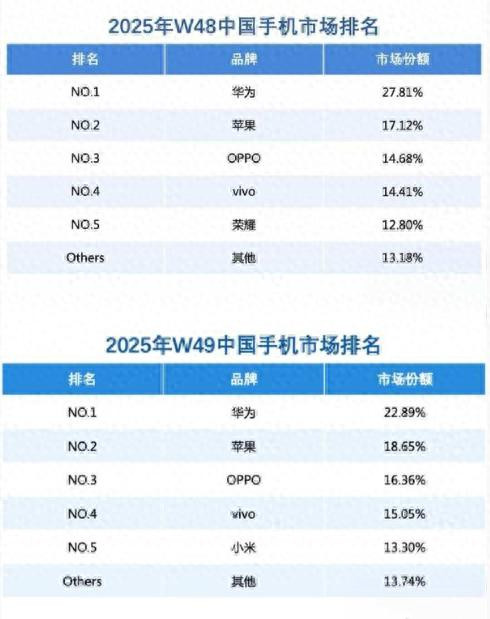 从具体数据来看,在第48周(W48)和第49周(W49)的中国手机商场名次中,华为发扬强势,商场份额别离高达27.81%和22.89%。而位居第二的苹果,在这两周对应的商场份额别离为17.12%(W48)和18.65%(W49)。