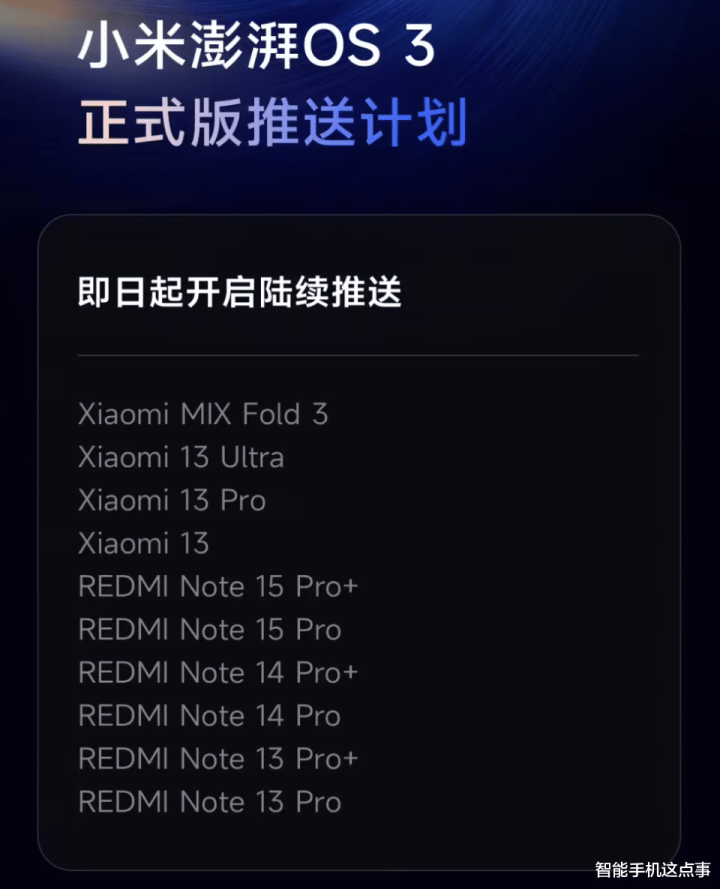 说到这里来和天下详备先容下更新的机型,本次得回滂湃OS 3郑再版推送的机型包括小米手机系列,区分是小米MIX Fold 3、小米13 Ultra、小米13 Pro、小米13。