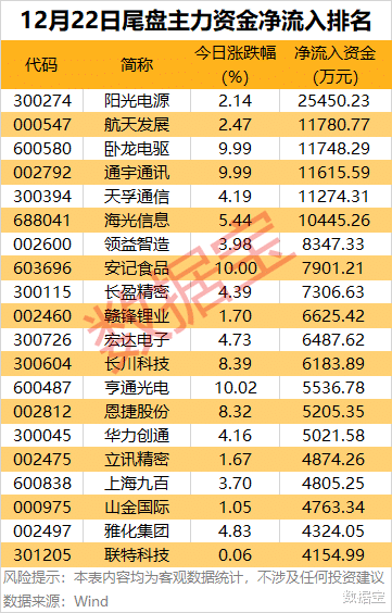 个股方面,阳光电源尾盘主力资金净流入超2亿元,居首;航天发展、卧龙电驱、通宇通讯、天孚通讯、海光信息5股尾盘主力资金净流入均超1亿元。