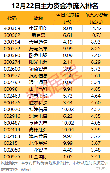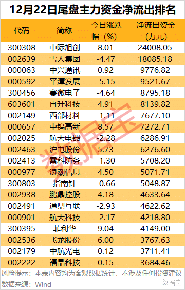 尾盘主力资金净流出方面,中际旭创、雪东谈主集团尾盘主力资金净流出均超1.8亿元。