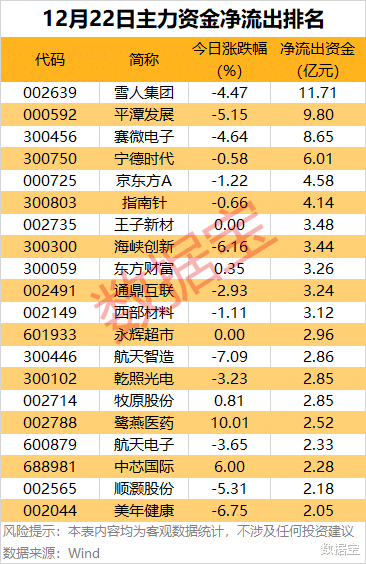 本日有75股主力资金净流出均超1亿元,其中,雪东谈主集团、平潭发展、赛微电子、宁德时间、京东方A、指南针净流出金额均超4亿元。